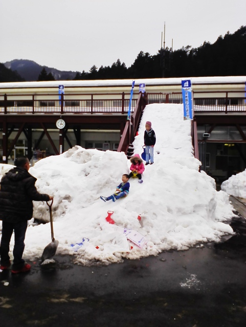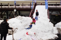 兄弟3人、雪遊びに大興奮。除雪後の雪の塊を利用して、おじいさまが専用の滑り台を作っておられました。平日で他のお客様が少なかったので、しばらく遊んでおられました。※お客様の混み具合によっては、安全のため雪遊びをお断りさせていただくことがあります。