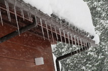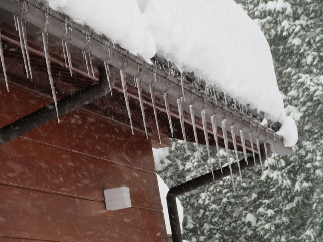 鋭い氷柱が何本も。綺麗ですが…早く屋根から落ちてください。